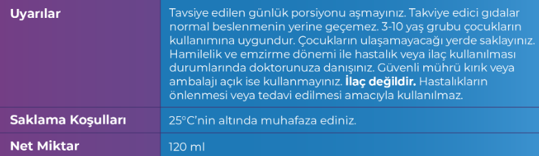 İlaç değildir; takviye edici gıdadır. Tavsiye edilen günlük kullanım dozu: 11 yaş ve üzeri yetişkinler için günde 10-30 ml tok karnına tüketilmesi önerilir. (10 ml=2 tatlı kaşığı) Tavsiye edilen günlük porsiyonu aşmayın. Takviye edici gıdalar normal beslenmenin yerine geçemez